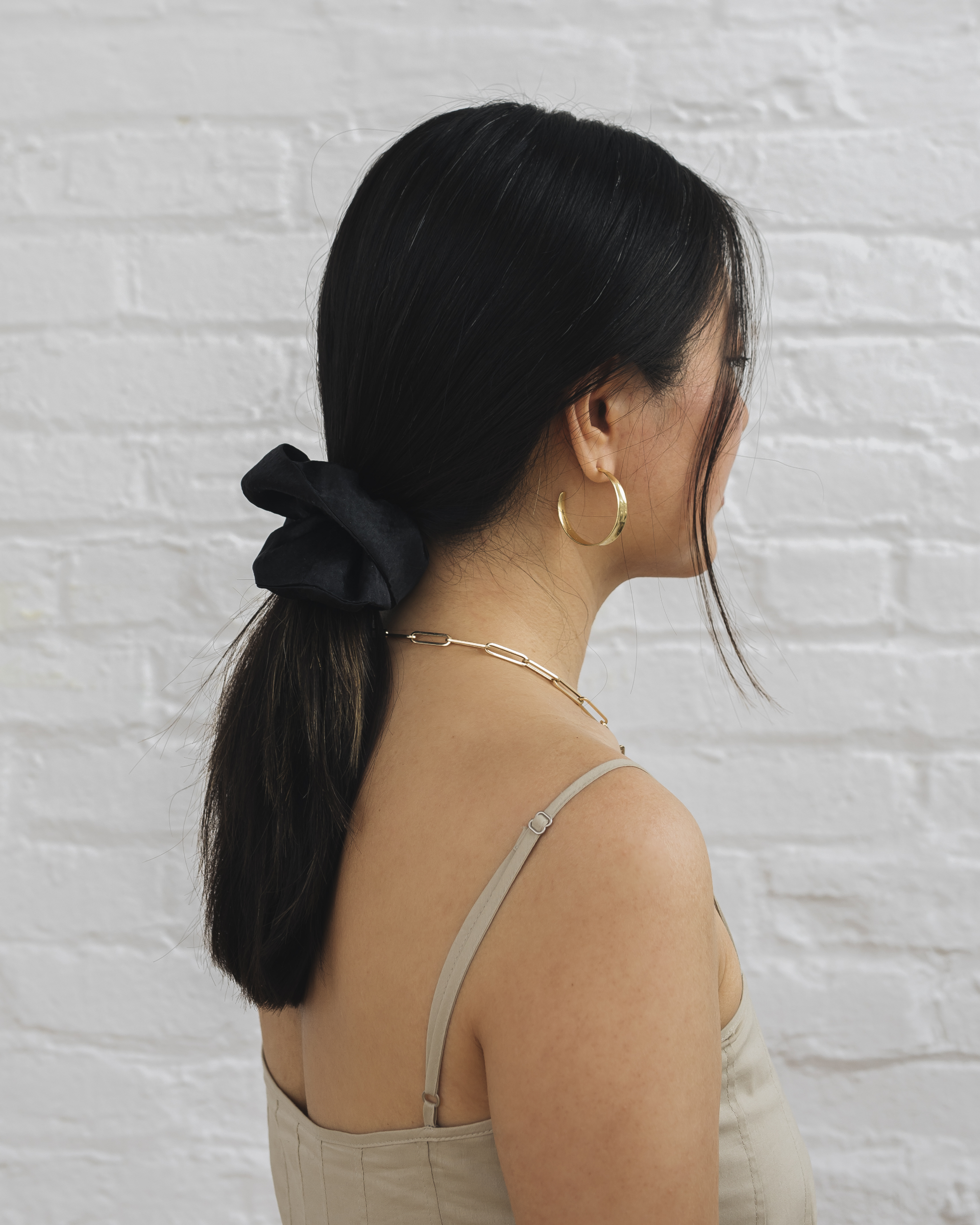 We get our silk from the same mills as Vera Wang and wash all the fabric before hand sewing each scrunchie to achieve that special hammered texture. Made in collaboration with Gigi Burris.