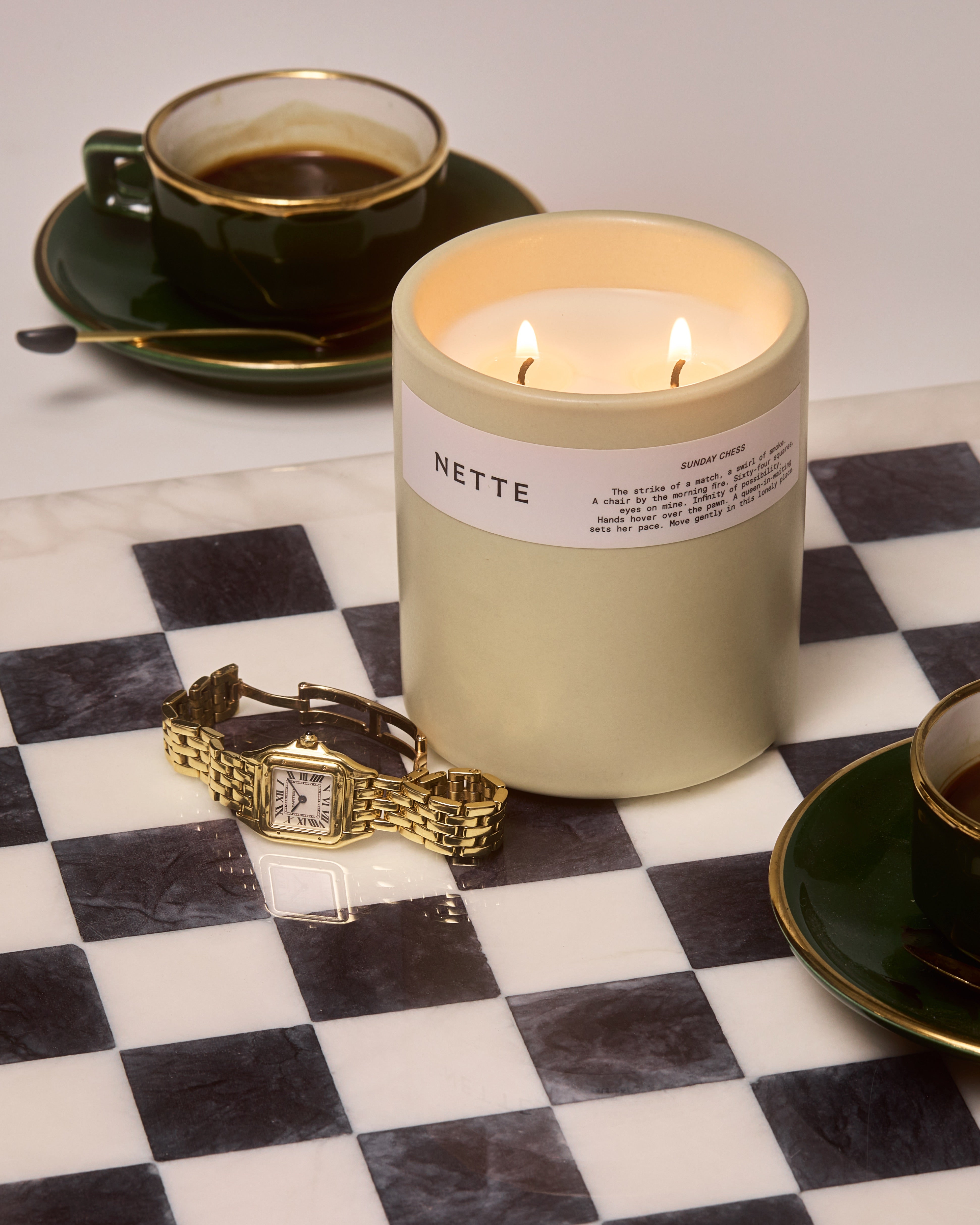 In Sunday Chess, incense and vanilla swirl together with notes of charcoal, resins, and amber for a scent that’s simultaneously smoky and sweet.